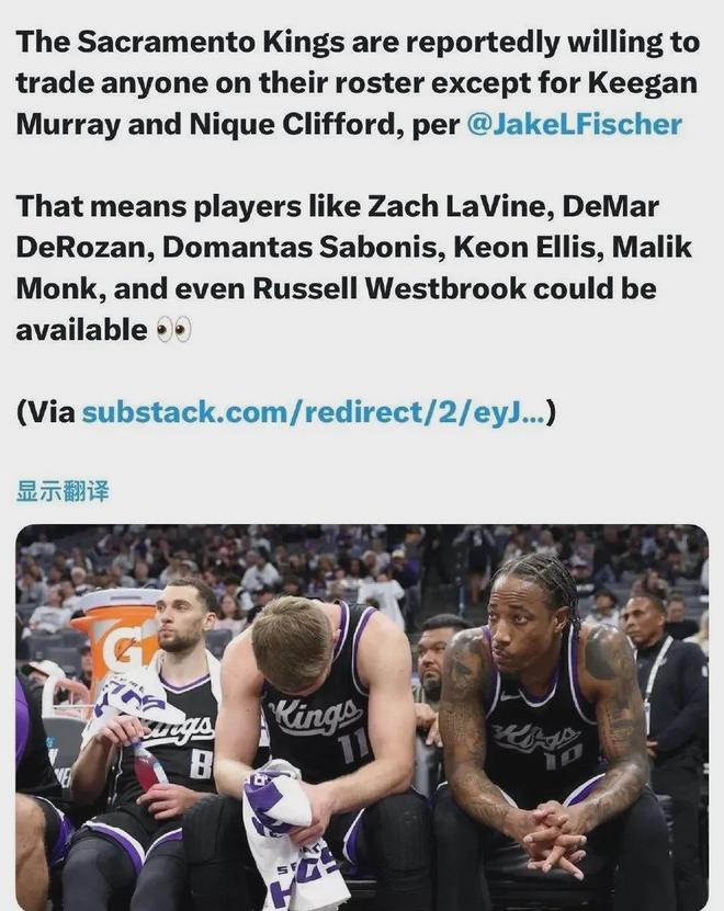 国王(目前4胜13负西部倒数第二)决定重建,除了25岁的默里以及今年首轮24号秀克利福德之外,其余球员有一个算一个全部摆上货架。
